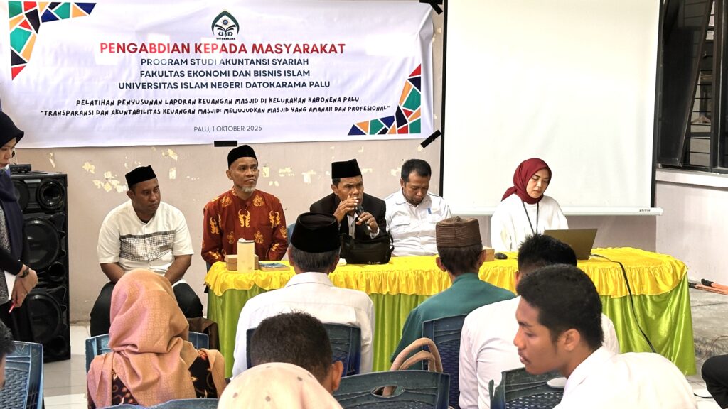 Palu (UIN Datokarama) – Program Studi Akuntansi Syariah Fakultas Ekonomi dan Bisnis Islam (FEBI) Universitas Islam Negeri (UIN) Datokarama Palu menggelar kegiatan Pengabdian Kepada Masyarakat (PKM) bertema “Pelatihan Penyusunan Laporan Keuangan Masjid di Kelurahan Kabonena Palu: Transparansi dan Akuntabilitas Keuangan Masjid Mewujudkan Masjid yang Amanah dan Profesional”. Acara ini berlangsung pada Rabu, 1 Oktober 2025, […]