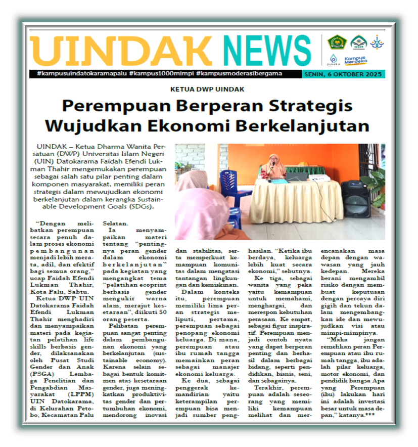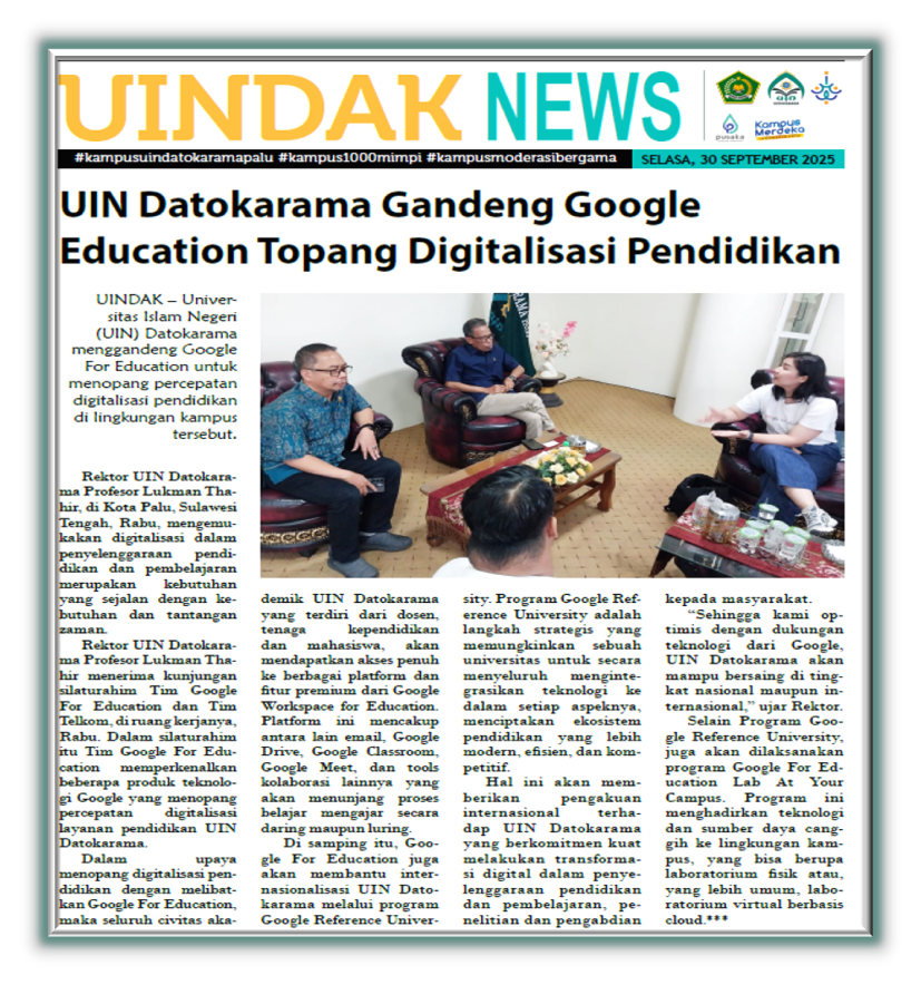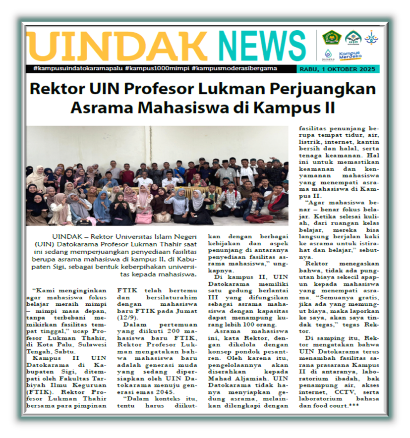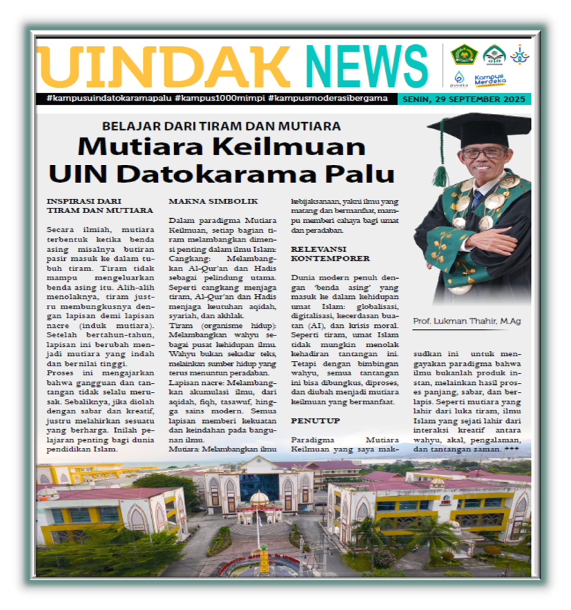 Edisi UINDAKNEWS hadir untuk menyuguhkan rangkaian informasi terbaru seputar aktivitas kampus, gagasan inspiratif dari sivitas akademika, serta liputan khusus mengenai isu-isu aktual yang relevan dengan dunia pendidikan, keagamaan, dan sosial. Melalui edisi ini, pembaca diajak untuk mengikuti dinamika UIN Datokarama Palu secara lebih dekat, sekaligus mendapatkan wawasan segar yang memperkaya pengetahuan dan pengalaman akademik.