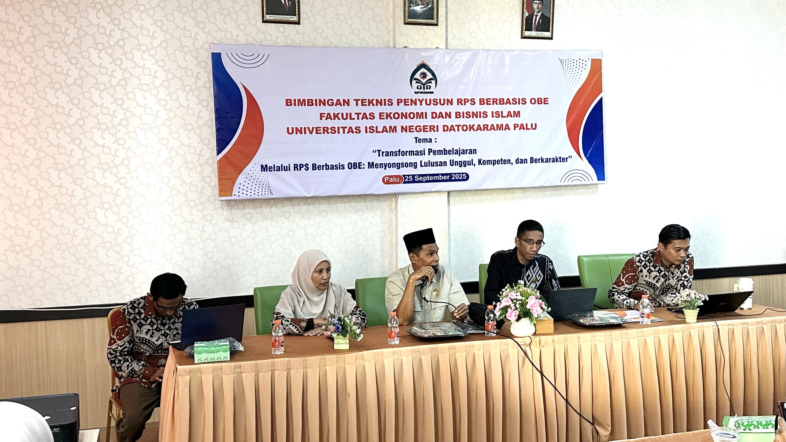 Palu (UIN Datokarama) – Fakultas Ekonomi dan Bisnis Islam (FEBI) Universitas Islam Negeri (UIN) Datokarama Palu menggelar Bimbingan Teknis Penyusunan Rencana Pembelajaran Semester (RPS) berbasis Outcome Based Education (OBE) di Aula FEBI, Kamis-Jum’at (25-26/9). Acara bertema “Transformasi Pembelajaran Melalui RPS Berbasis OBE: Menyongsong Lulusan Unggul, Kompeten dan Berkarakter” ini diikuti oleh puluhan dosen dan staf pengajar dari berbagai program studi di bawah naungan fakultas, sebagai upaya memperkuat kualitas pendidikan di tengah tuntutan era digital dan globalisasi ekonomi syariah.