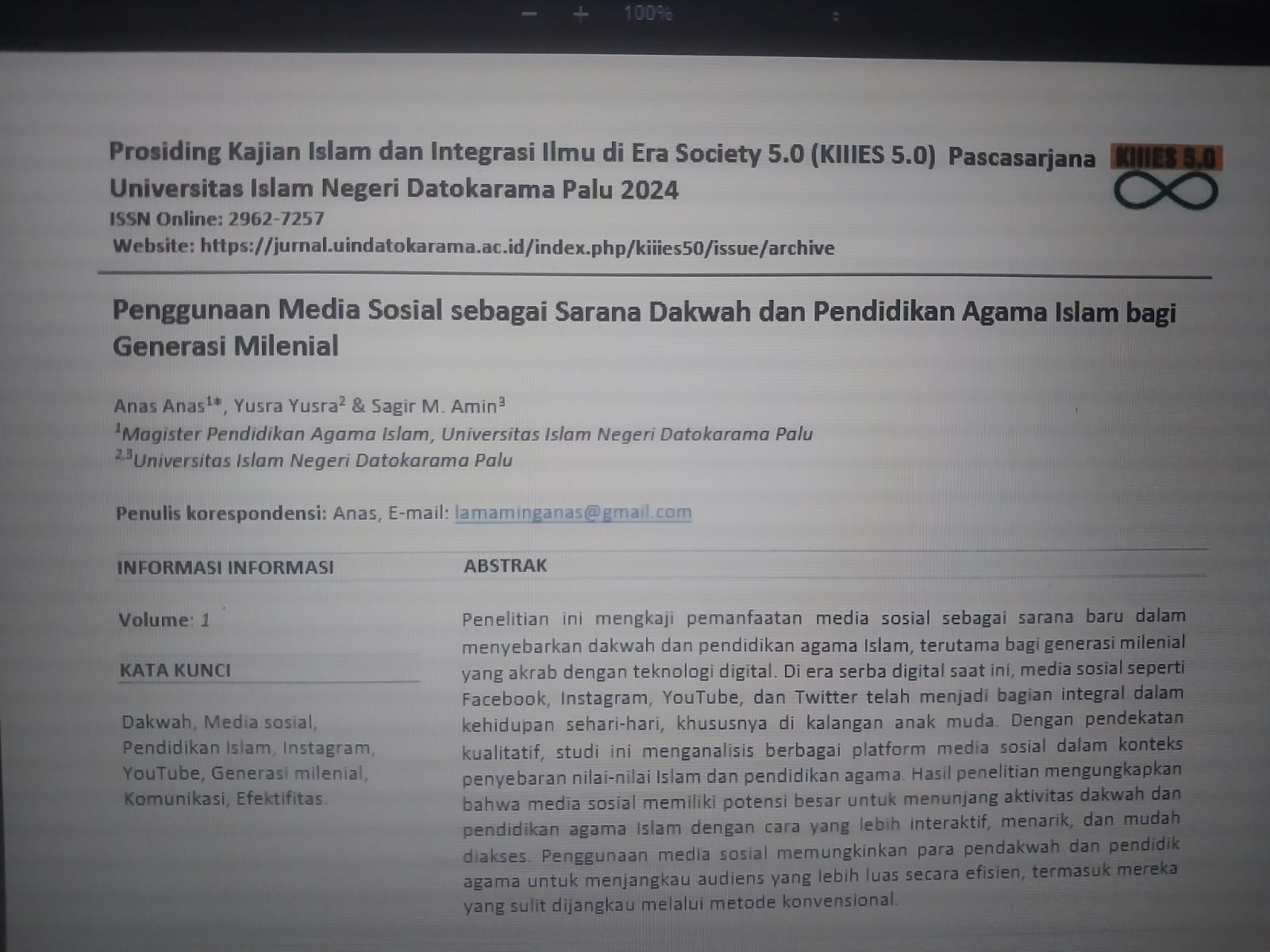Riset ini dilakukan oleh tiga orang akademisi UIN Datokarama yaitu Anas, Yusra, dan Sagir M Amin. Dengan pendekatan kualitatif, studi ini menganalisis berbagai platform media sosial dalam konteks penyebaran nilai-nilai Islam dan pendidikan agama. Hasil penelitian mengungkapkan bahwa media sosial memiliki potensi besar untuk menunjang aktivitas dakwah dan pendidikan agama Islam dengan cara yang lebih interaktif, menarik, dan mudah diakses.