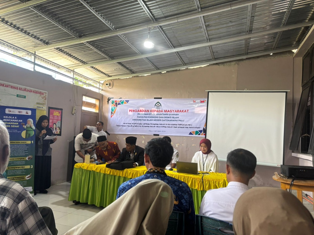 Palu (UIN Datokarama) – Program Studi Akuntansi Syariah Fakultas Ekonomi dan Bisnis Islam (FEBI) Universitas Islam Negeri (UIN) Datokarama Palu menggelar kegiatan Pengabdian Kepada Masyarakat (PKM) bertema “Pelatihan Penyusunan Laporan Keuangan Masjid di Kelurahan Kabonena Palu: Transparansi dan Akuntabilitas Keuangan Masjid Mewujudkan Masjid yang Amanah dan Profesional”. Acara ini berlangsung pada Rabu, 1 Oktober 2025, di Aula Kantor Kelurahan Kabonena, Kota Palu, Sulawesi Tengah.